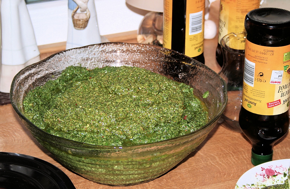 ZubereitungVorbemerkungenVOR dem Herstellen einer Kräuterpaste unbedingt beachten: Viel Zeit einplanen! Je nach beabsichtigter Kräutermenge - oder des sich im Sammelrausch ergebenden Kräuterberges bzw. des/der zu voll gewordenen Eimer/s oder Korbs - kommt noch mindestens eine Stunde für die Verarbeitung hinzu, die sich sofort an das Sammeln anschließen muss. Je nach Menge kann man für den gesamten Vorgang locker einen ganzen wunderbaren Tag verbringen :-). Vor dem Sammeln an genügend Öl sowie an geeignete Schraubgläser denken bzw. bereitstellen. Zur benötigten Menge sh.u.(*2) Man verwendet allgemein nur junge, makellose Pflanzenteile. Kräuter schon beim Pflücken auslesen (bzw. VOR dem Abzupfen oder Abknipsen mit den Fingern oder dem Abschneiden mit der Schere "unter die Lupe nehmen") und vor dem Hineinlegen in den Eimer oder Korb gut ausklopfen. Kräuter nicht waschen; wer sie jedoch waschen möchte, muss sie anschließend gründlich trocknen. Geeignete KräuterGeeignet sind z.B. Bärlauch Basilikum Beifuß Breitwegerich Brennnessel Dill Fenchelkraut Frauenmantel Giersch Gänseblümchen- Blüten und -Blätter Gundelrebe Hirtentäschel Kapuzinerkresse Katzenminzespitzen Knolau Kresse Lavendelspitzen Löwenzahn-Blüten und -Blätter(*3) Maggikraut(Liebstöckel) Oregano Petersilie Pfefferminze Pimpinelle (kleiner Wiesenknopf) Rosmarinspitzen Salbei Sauerampfer Schafgarbe Schnittlauch Selleriekraut (Schnittsellerie oder Kraut von Knollensellerie) Spitzwegerich Taubnesselspitzen Thymian Vogelmiere Walderdbeerblätter Zitronenmelisse (*3) Die Stiele des Löwenzahns sind ebenfalls wertvoll und heilend. Wegen des bitteren Geschmacks jedoch mäßig verwenden. Die persönliche "Grenze" ausprobieren! Am besten zum Schluss des Verarbeitungsvorgangs nach und nach Stiele beifügen und zwischendurch probieren. Bei vielen Kräutern sind auch die Blüten lecker und dekorativ. HerstellungDie Kräuter trocken wiegen. 10% davon Salz abwiegen. Ist die Paste zum Verzehr innerhalb der nächsten Tage geplant, kann auch weniger oder gar kein Salz verwendet werden. Sehr "sperrige" Kräuter zunächst mit einem Messer in handlichere Stücke schneiden. Harte Stiele entfernen. Die Kräuter unter Hinzufügen von Öl mit dem Mixer oder in der Küchenmaschine mit dem Messereinsatz zerkleinern (für kleine Mengen eignet sich eher ein Mixstab). Gleich zu Beginn des Mixvorgangs etwas Öl zu den Kräutern gießen, um diese möglichst schonend zu zerkleinern. Nach und nach soviel Öl hinzufügen, bis eine Paste von angenehmer Konsistenz entsteht. Ob grob oder sehr pastös ist Geschmacksache und hängt auch von der Beschaffenheit des Krauts/der Kräuter ab. Mixer-/ Maschinenfüllung(en) in eine Schüssel umfüllen und gründlich mit dem abgewogenen Salz vermengen. Große Mengen an Kräutern, die nicht zu zart sind, können durch einen Fleischwolf gedreht werden. Hier wird das Öl erst zum Schluss beigefügt, wenn die zerkleinerten Kräuter mit dem Salz vermischt werden. In gut schließende Gläser füllen. Während des Einfüllens mehrmals mit einem Löffel die Paste "einstampfen", um Luftlöcher zu vermeiden. Oben glattstreichen und anschließend unbedingt mit etwas Öl bedecken! Hält im Kühlschrank problemlos ein halbes Jahr, wahrscheinlich auch länger. Paste stets mit sauberem Löffel entnehmen. Danach wieder glatt streichen, ggf. mit etwas Öl bedecken und sofort wieder in den Kühlschrank stellen! Glas nie lange "draußen" stehen lassen, sondern gewünschte Menge zum Verzehr abnehmen. Besonders lecker schmeckt Paste aus Kapuzinerkresse. Dazu Blätter, zarte Stängel, Blüten und Samenkapseln (wenn nicht zu hart) verwenden. Hervorragend geeignet zur "Wintervorbereitung" des Immunsystems ist Kapuzinerkresse zusammen mit Meerrettich im Verhältnis 5 zu 2 (je nach Geschmack auch anders). Die Meerrettichwurzel wird geschält und kann in der Küchenmaschine mit einer ganz feinen Reibscheibe sehr fein gerieben werden. Dabei rechtzeitig an viel Frischluft denken bzw. zwischendurch mit der Nase an einem anderen Ort frische Luft schnappen :-). Damit die helle Farbe erhalten bleibt, sofort nach dem Reiben in ein gut verschließbares Gefäß füllen, mit Öl mischen und mit einer Ölschicht bedecken. Im Kühlschrank aufbewahren. Es können mehrere Kräuter gleichzeitig zu einer Paste verarbeitet werden, je nach Vorkommen in den Jahreszeiten. "Sortenreine" Kräuterpasten sind natürlich auch möglich. Über die heilende Wirkung der einzelnen Kräuter kann man in sehr vielen Kräuterbüchern nachlesen und so gezielt das einzelne Kraut einsetzen. Eine gute Kombination ist Salbei mit Knoblauch; erprobtes Gewichtsverhältnis 50g:2,5g. Da Salbei recht zäh sein kann, nach dem Mixen in der Küchenmaschine evtl. noch kurz mit dem Pürierstab zerkleinern. Der Kräuterpaste kann nach Geschmack und Vorliebe vieles zugefügt werden: Senf, Meerrettich, Sonnenblumenkerne sowie jede andere Art von Kernen oder Nüssen.... (*2) Benötigte Ölmenge:Je weniger Kräuter, umso mehr Öl muss hinzugegeben werden, um die Kräuter so schonend wie möglich in der Küchenmaschine/dem Mixer zu zerkleinern. Gilt nicht für die Verwendung des Fleischwolfs. Ungefähre Erfahrungswerte: