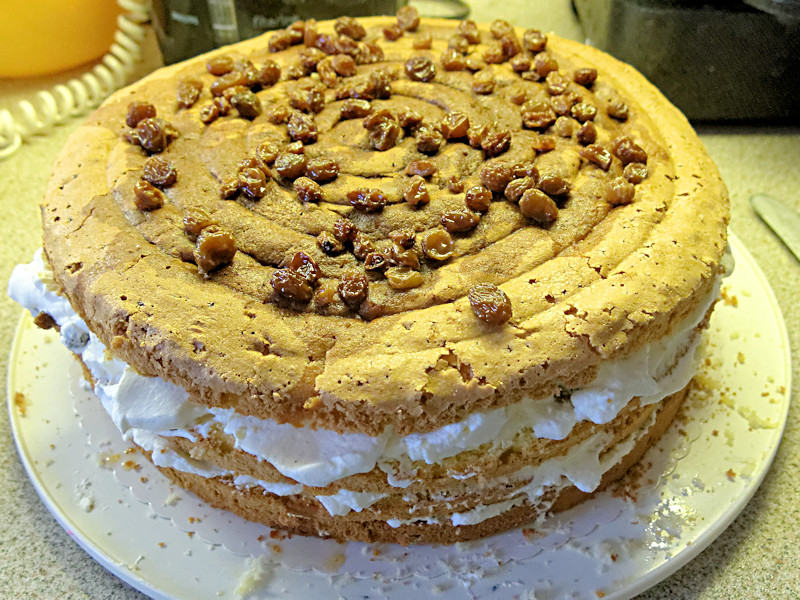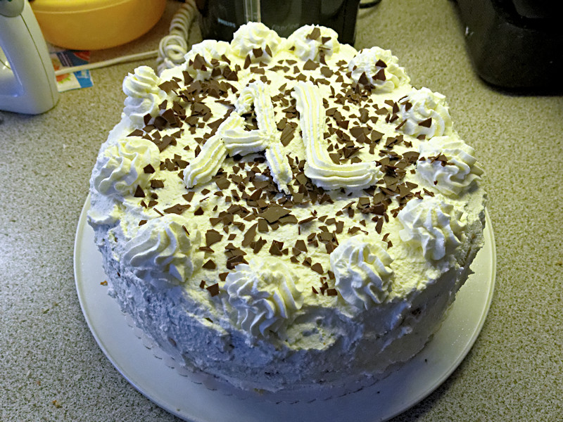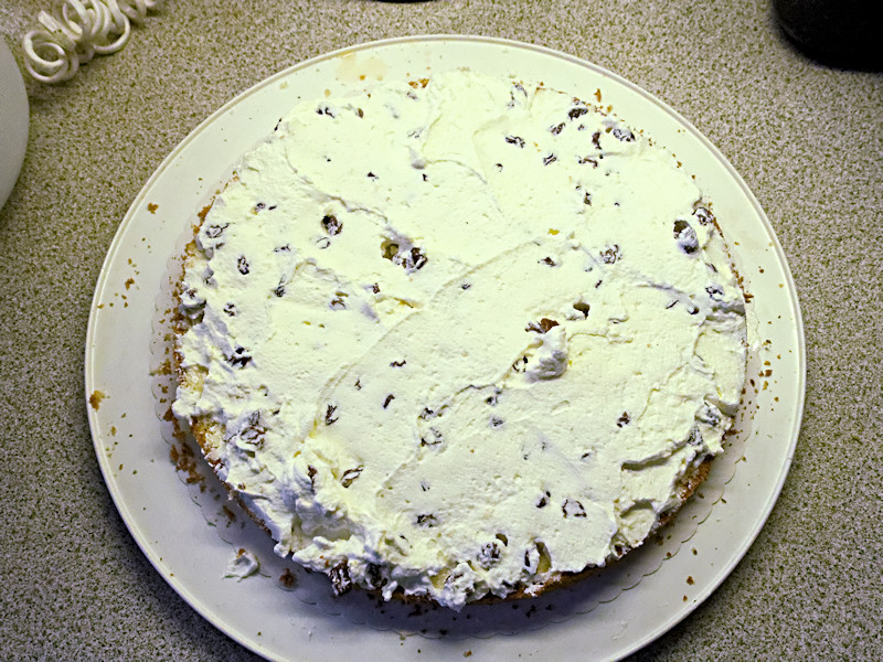 ========== REZKONV-Rezept - RezkonvSuite v1.2 Titel: Moorteufeltorte Kategorien: Kuchen-Torten Menge: 1 Rezept Biskuitboden 26 cm (von 8 Eiern) Zutaten für die Füllung: Rosinen Rum 54% 1 Ltr. Schlagsahne (davon 200ml für Verzierung) gemahlene Vanille Ev. Sahnesteif ============================ QUELLE ============================ NDR Landpartie 2004 Köchin: Gisela Wellbrock, Café zum Brinkhof, Osterholz- Scharmbeck -- Erfasst *RK* 20.05.2004 von -- Wolfgang Kynast Rosinen in Rum einlegen und ein paar Tage durchziehen lassen. Die Sahne steif schlagen und Vanille einrieseln lassen. Den Biskuitboden dreimal waagerecht durchschneiden und den ersten Boden mit Rumrosinen belegen. Die Sahne darüber streichen. Dann den zweiten Boden darauf legen und wie den ersten Boden belegen. Danach den dritten Boden darauf legen und belegen. Anschließend mit dem vierten Boden abdecken und mit Sahne einstreichen und verzieren. =====